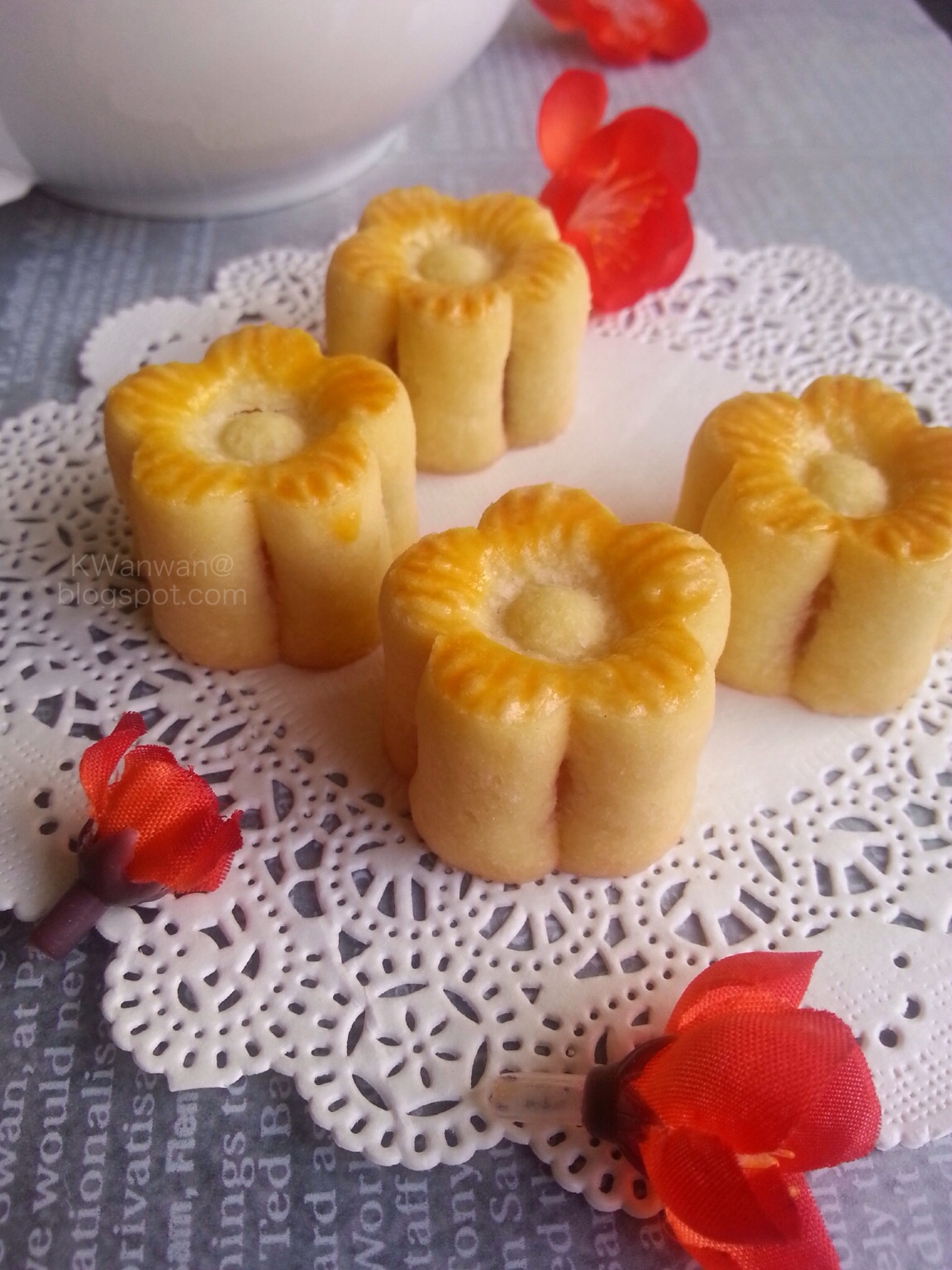 1. 把黄梨馅(我使用10g)搓成绵羊造型放在以花型切模所裁切出的面团上。